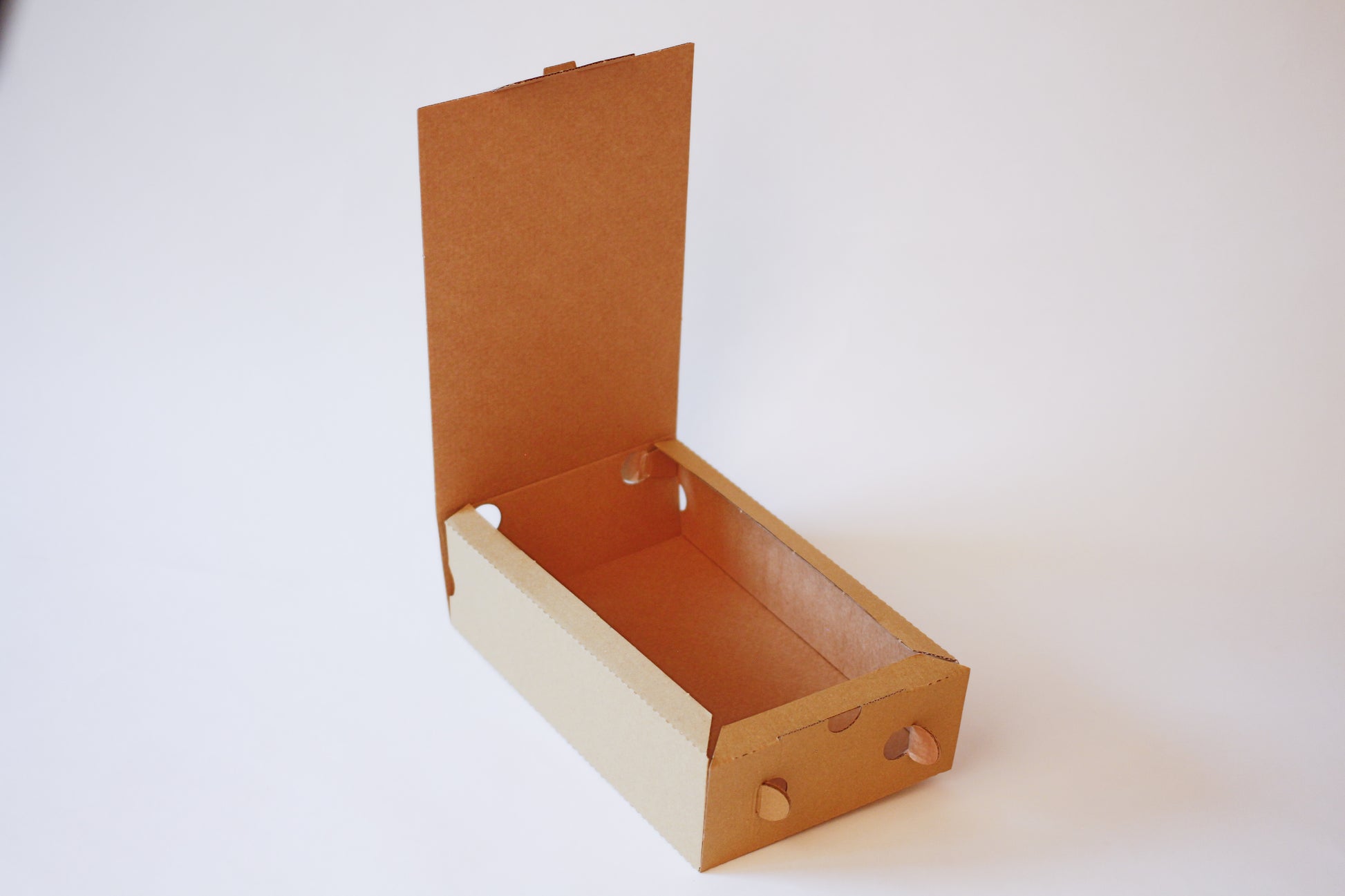 Aus stabiler, brauner Pappe – lebensmittelecht und stapelbar.